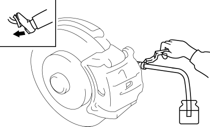 5. While the brake pedal is depressed, the other should loosen the bleeder screw using a commercially available flare nut wrench, drain out any fluid containing air bubbles, and tighten the bleeder screw.